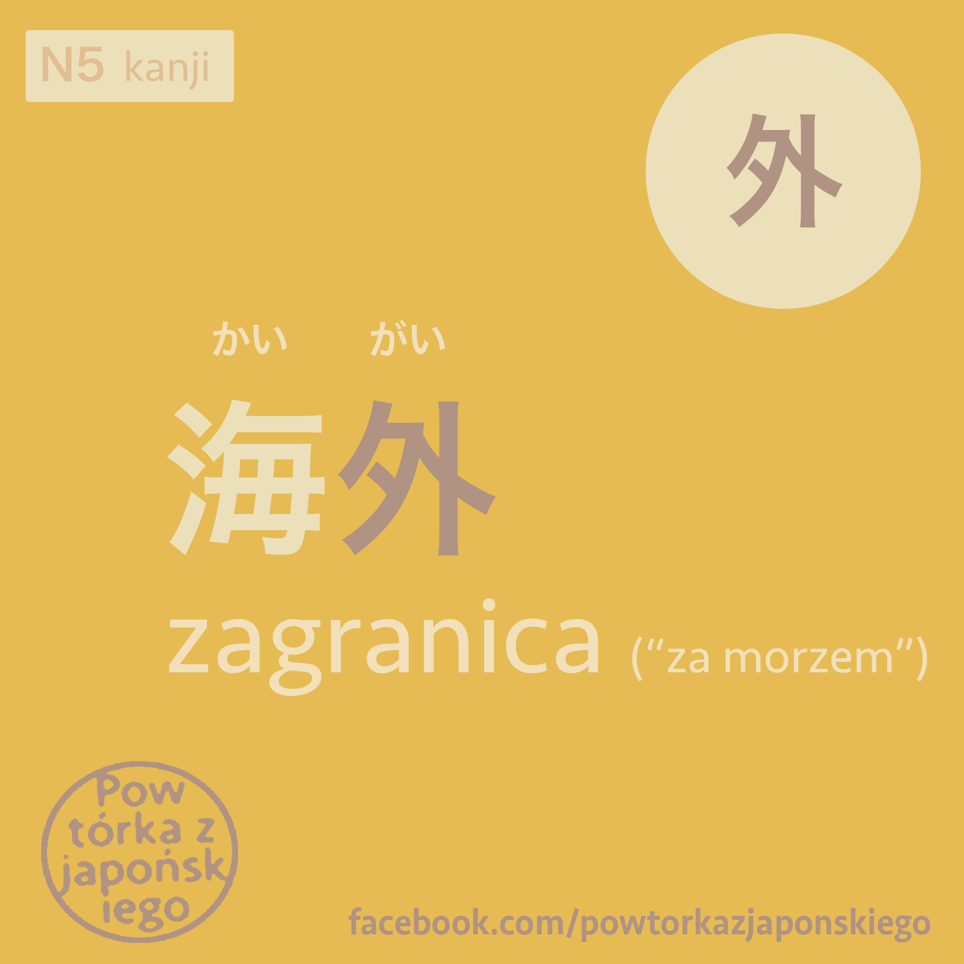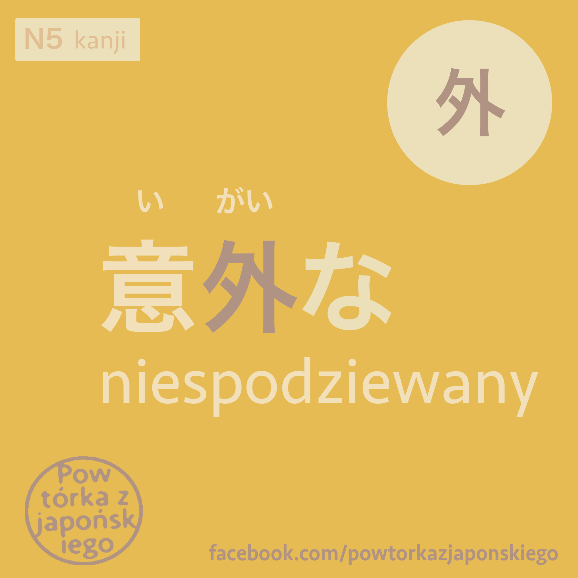 Po takim wstępie, pora przyjrzeć się samemu znakowi 外. Poniżej znajdują się inne czytania znaku, poza „gai”. W galerii znajdziecie popularne japońskie słówka i codzienne zwroty, w których go użyjemy. Natomiast na samym dole, znajdziecie też mini test, który pomoże Wam sprawdzić czy pamiętacie ich znaczenie. To kanji jest na poziomie: JLPT N5外